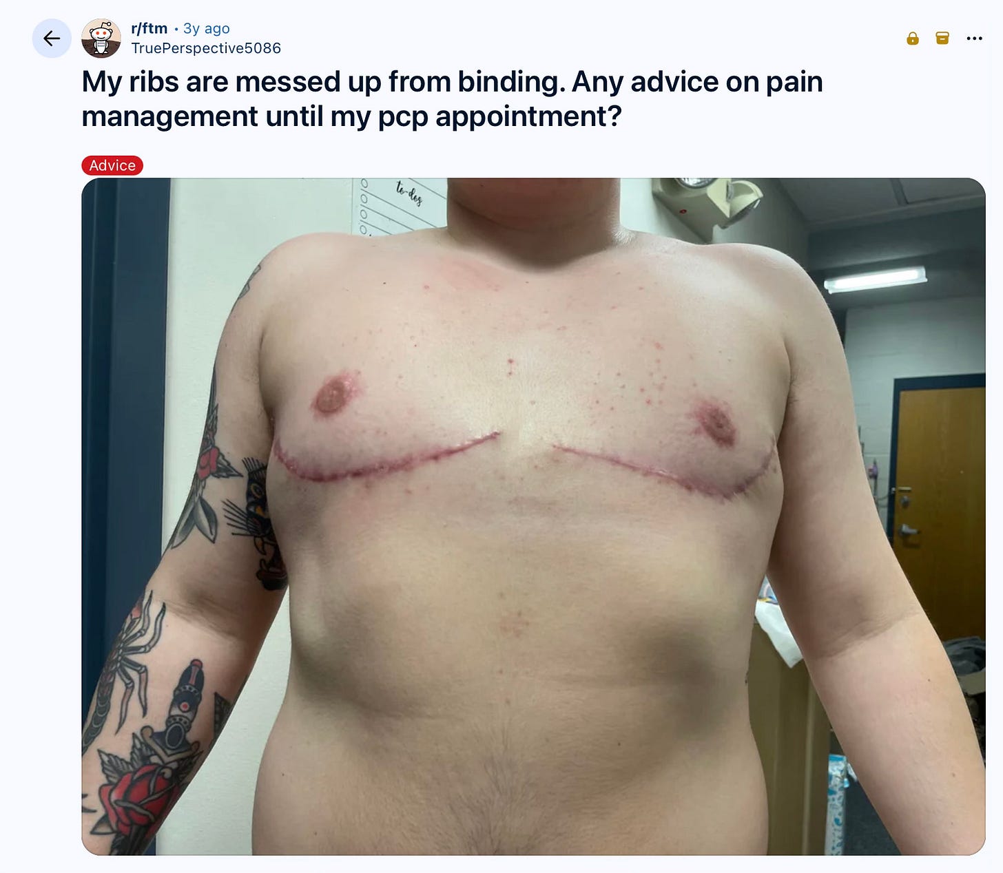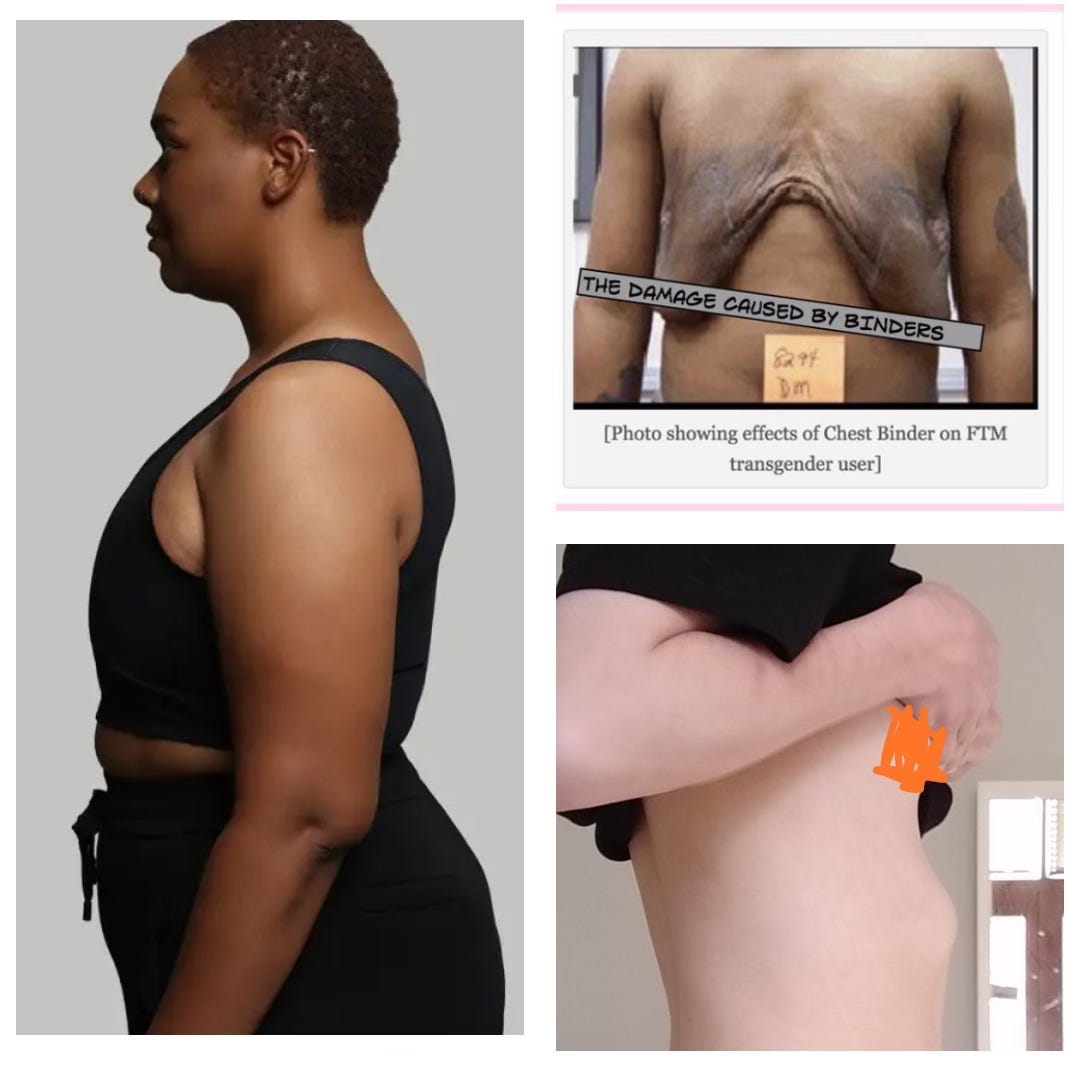 Speaking from a bit of lived experience here— breast binding is so physically uncomfortable and damaging that many girls cannot tolerate it long-term. Instead of alleviating distress, binding often worsens it by damaging breast tissue and causing significant, function-impairing harm to surrounding muscles, ribs, skin, nerves, posture, and skeletal structures. That damage is then interpreted as further evidence that the breasts themselves are intolerable or ‘wrong’ on the body. As a result, many girls become even more desperate to remove them entirely.