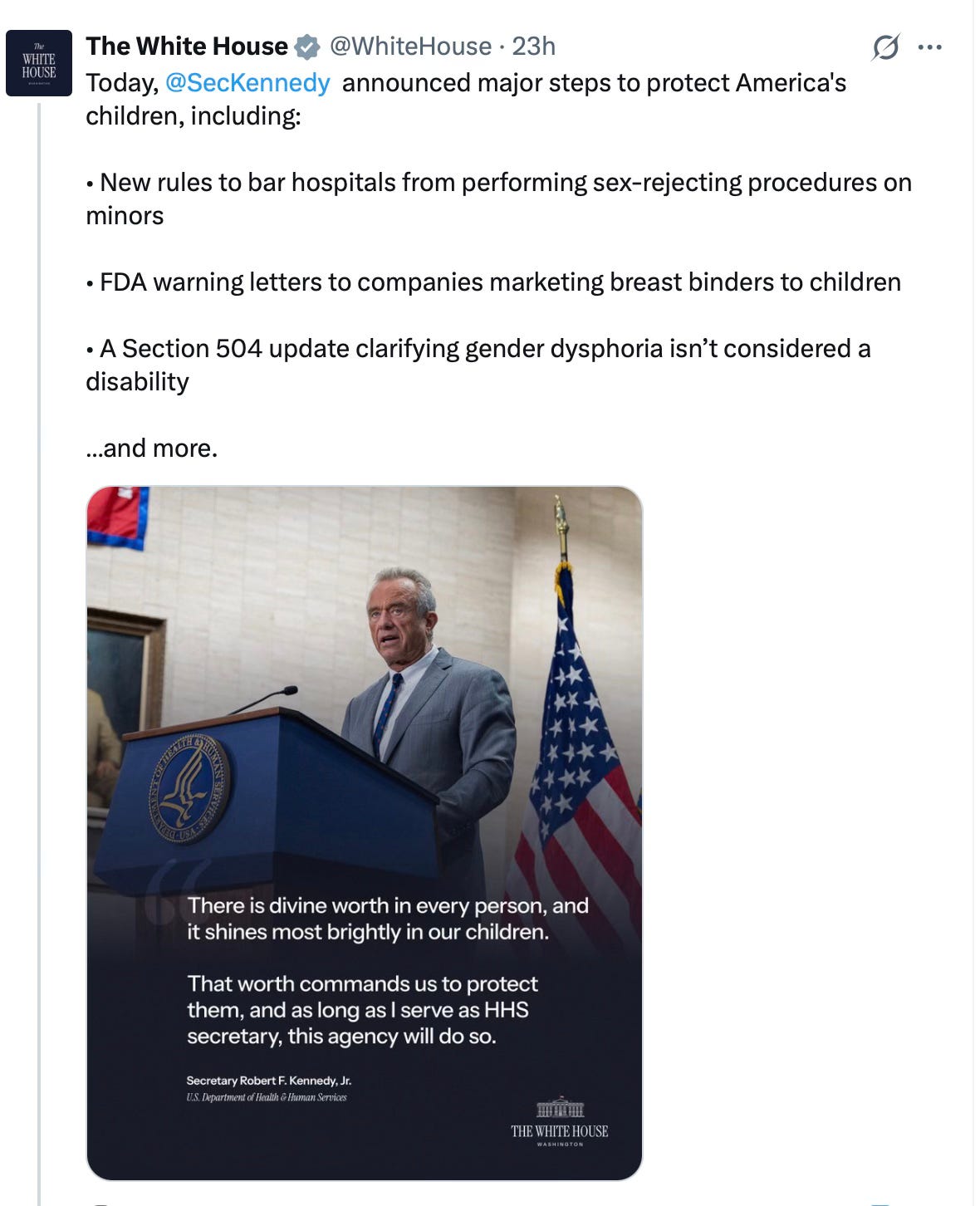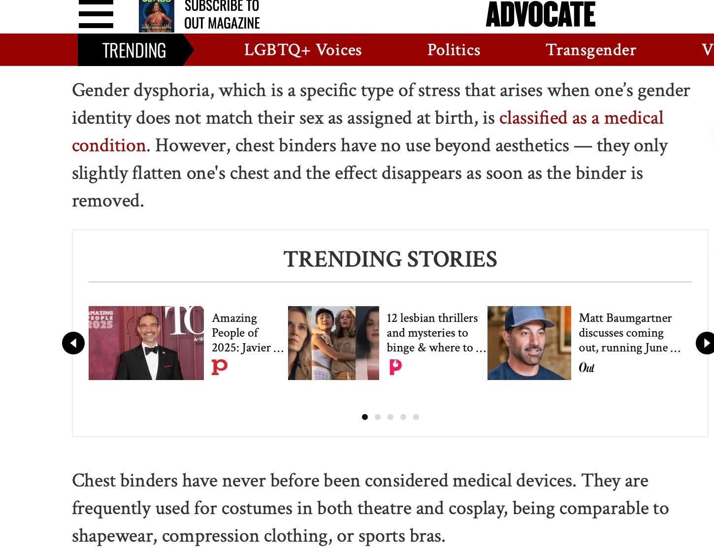 In response to Secretary Kennedy’s declaration, The Advocate published a piece claiming breast binders have “no use beyond aesthetics” and that “the effect disappears as soon as the binder is removed.” This framing reveals everything wrong with how trans activists think about reversibility. When they say “the effect disappears,” they’re only talking about immediate aesthetic reversibility—whether the chest looks flat. They’re not talking about the rib deformities, nerve damage, chronic pain, or damaged breast tissue that don’t disappear.