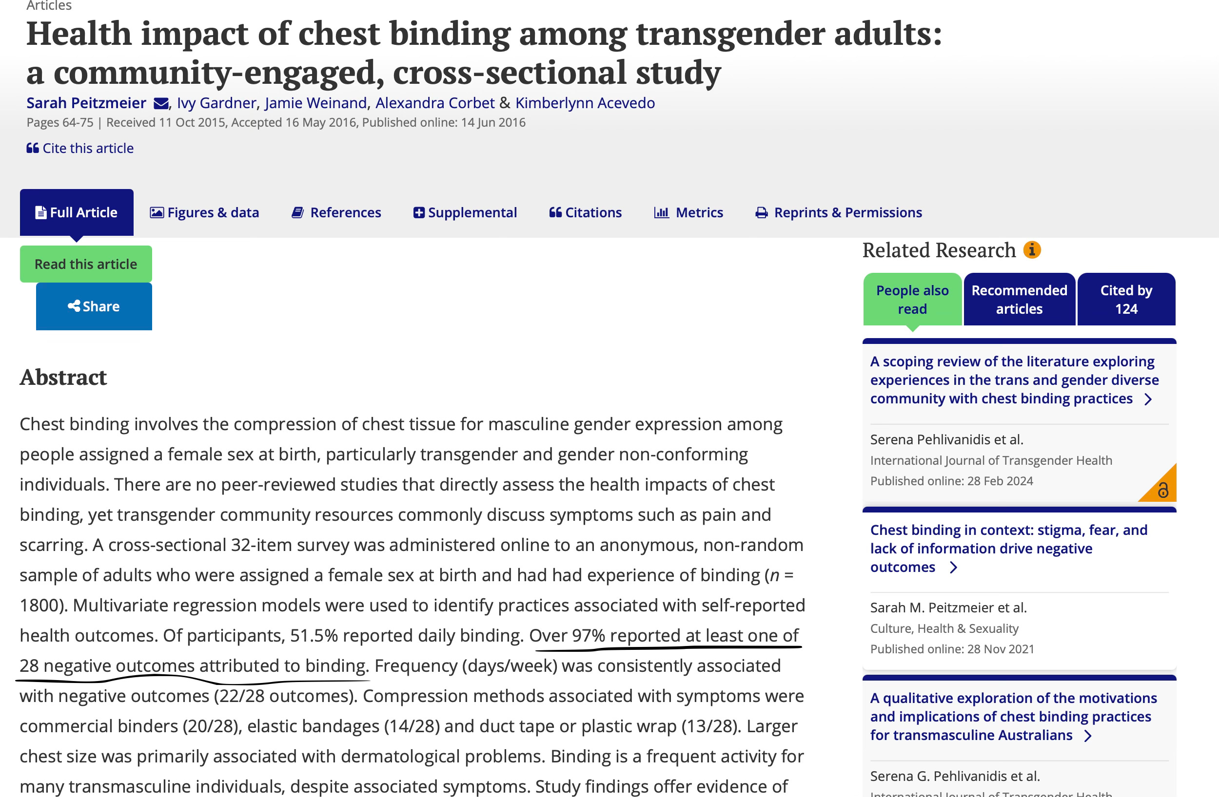 To this day, there is not one peer-reviewed study which supports the assertion that breast binding can be done safely, either in children or in adults. At the time the 2016 study was published, it noted that “there are no peer-reviewed studies that directly assess the health impacts of chest binding,” meaning companies and clinics had already knowingly been making safety claims with zero evidence to back them up.