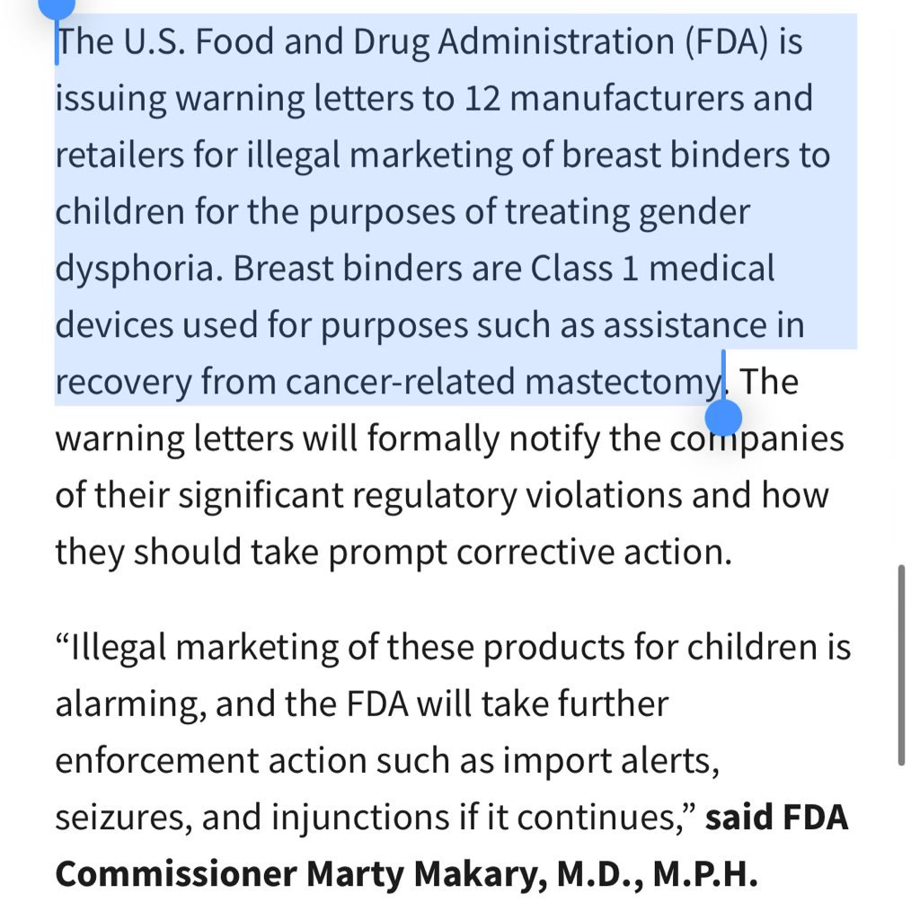 Despite the fact that these harms have been published in multiple journal articles since at least 2016, companies that sell breast binders do not include this information. For that reason, the FDA has issued warnings to 12 of these companies.
