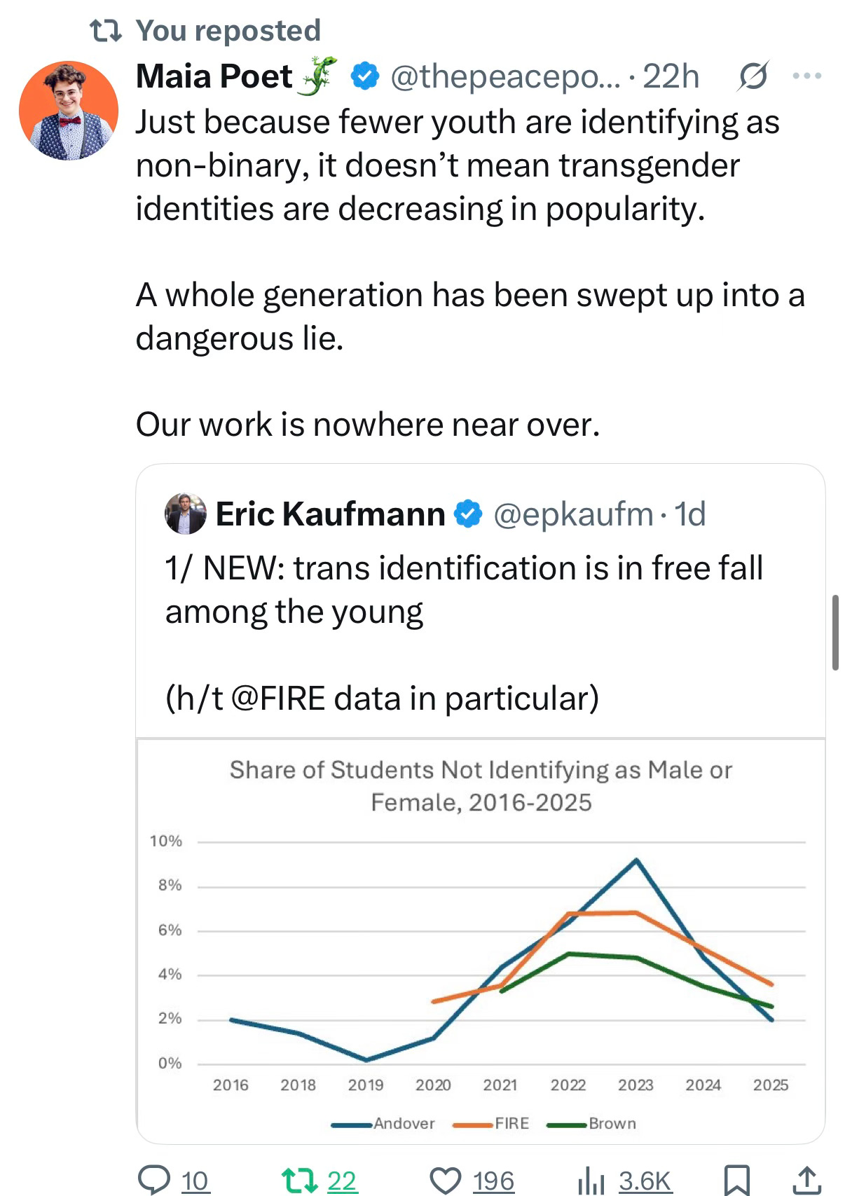 A British academic named Erik Kaufmann went mega-viral on X for publishing data from FIRE which showed a steep drop-off in young people identifying as neither male nor female (which has been widely interpreted to refer to non-binary identities) with the added analysis of “trans identification is in free fall among young people.” Large accounts including Elon Musk and Matt Walsh retweeted the data set with celebratory statements proclaiming the end of transgenderism. Suddenly, every account from millions of followers, to thousands, to hundreds, to tens of followers began celebrating the end of trans.