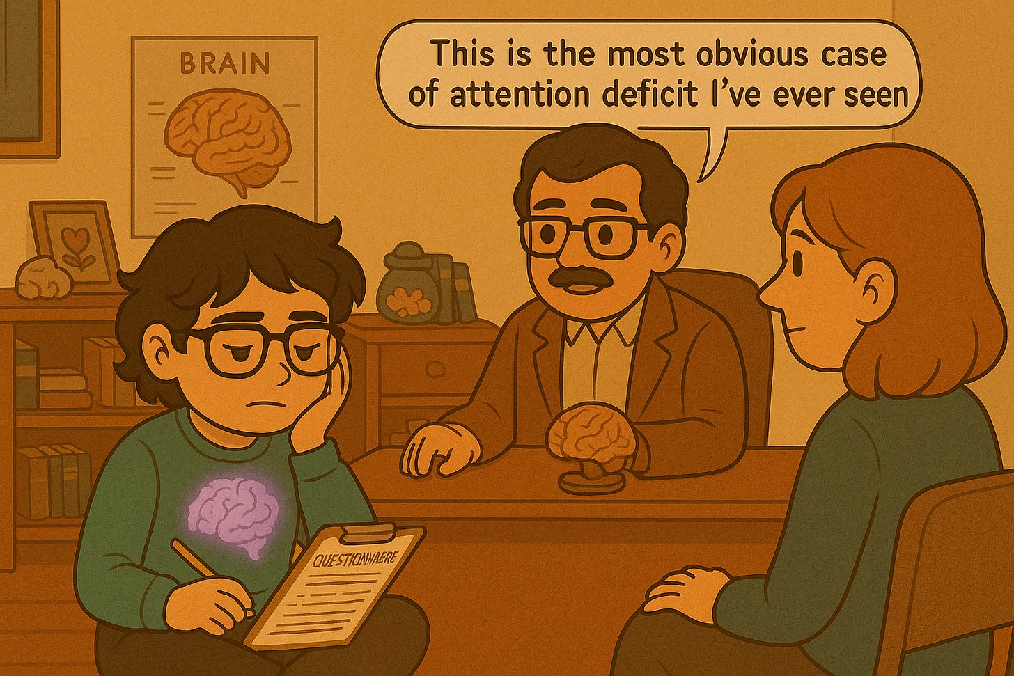 The psychiatrist, Dr. H, had an office crammed with things to look at—including a poster detailing the different parts of the brain. As he chatted with my mom about my history, I sat there rapidly bouncing my leg, filling out the questionnaire he handed me. That sheet of paper, he said, would help determine whether or not I had ADHD. I’m surprised he had me fill out a questionnaire, considering I had made it clear to him that I had already previously been obsessed with studying ADHD and had the diagnostic criteria memorized.