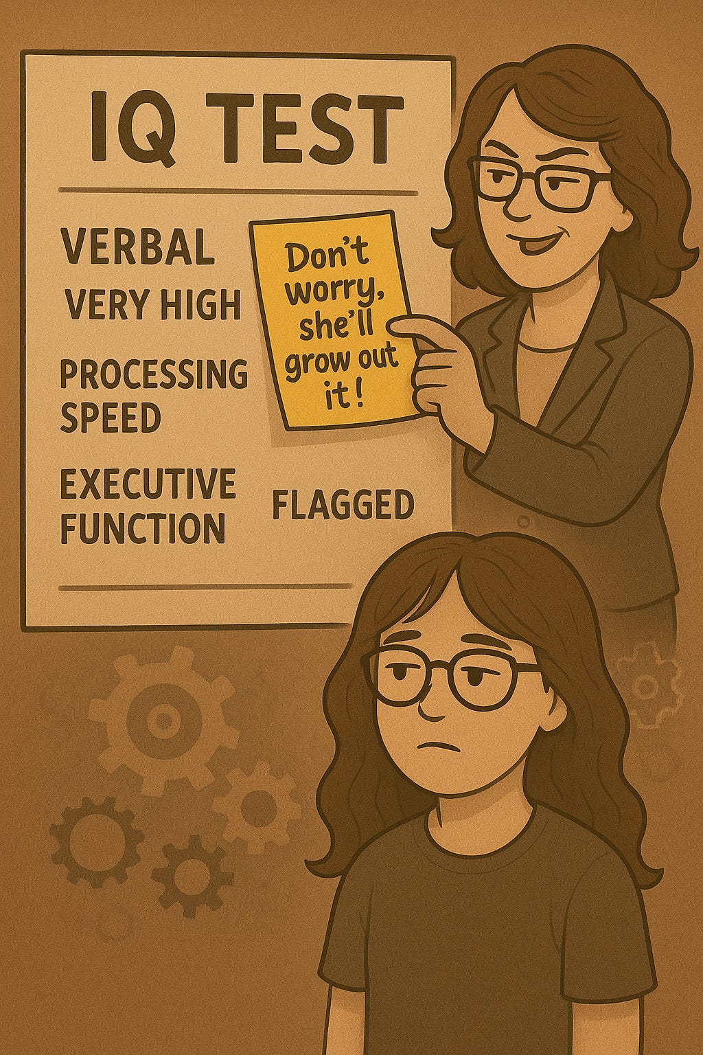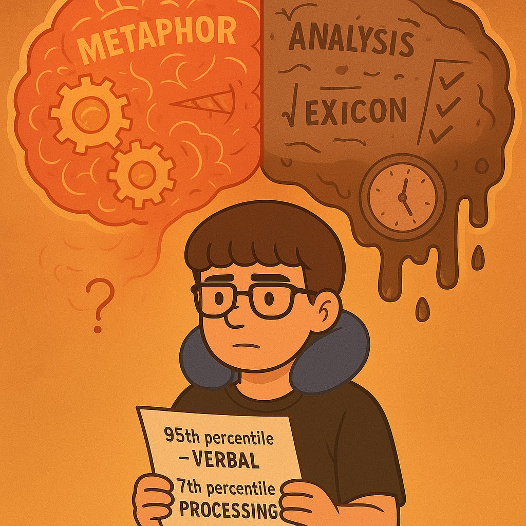 But buried underneath these impressive scores were deep processing deficits: my visual-motor speed was in the 7th percentile, and my ability to switch attention, follow sequences, or respond quickly was startlingly low. It was as if the gears in my brain spun in different directions—some running on rocket fuel, others grinding under molasses.
