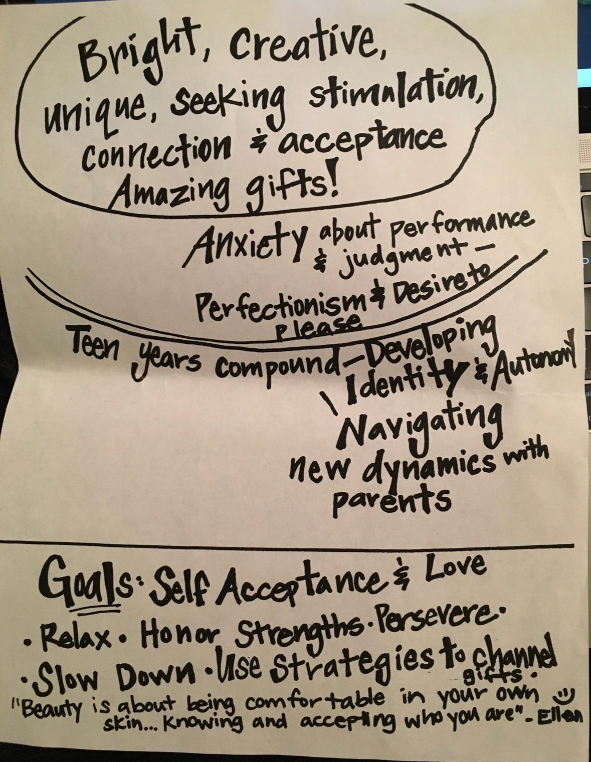 The note written about me at about 13 years old following my assessment reads: “bright, creative, unique, seeking stimulation, connection and acceptance. Amazing gifts. Anxiety about performance and judgement, perfectionism and a desire to please. Teen years compound identity and autonomy, and navigating new dynamics with parents. Goals: self-acceptance and love.” She also gave me some tips: “relax, honor strengths, persevere, use strategies to channel gifts” without giving me any such strategies— mind you. And her assessment report finishes with a quote from Ellen DeGeneres, whom I was obsessed with at the time stating “beauty is about being comfortable in your own skin… knowing and accepting who you are.”