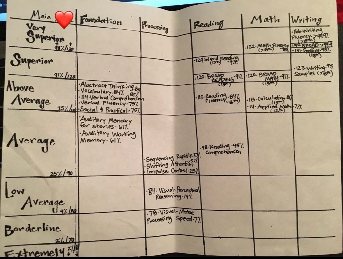 I had such a perplexing mix of strengths and weaknesses that the evaluator struggled to draw a clear conclusion. My verbal and abstract reasoning skills were in the very superior range—well above the 95th percentile—which meant I could make complex connections, use advanced vocabulary, and articulate ideas like someone much older. My reading and writing scores, too, reflected a kind of fluency and creativity that confirmed I wasn’t just imagining the flashes of brilliant excitement I felt as I strung precise, individual words into ornate quilted drafts.